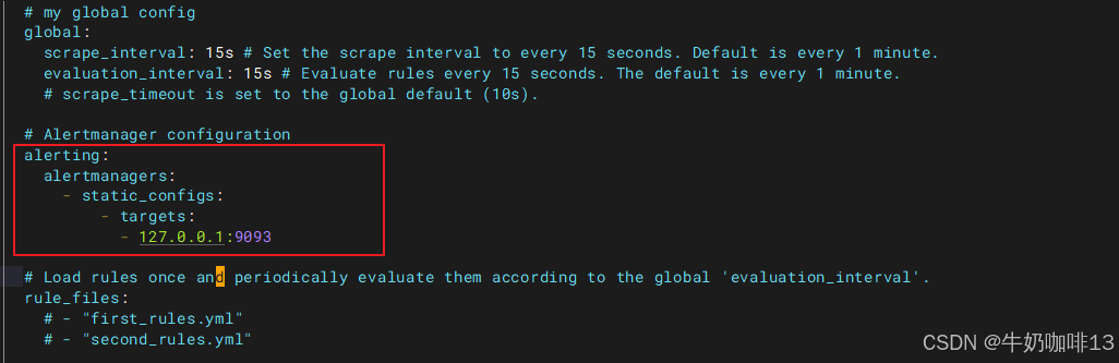默认情况下prometheus server与Alertmanager是相互独立的两个组件,要使他们协作起来,需要在prometheus server上prometheus.yml文件中打开如下配置即可: