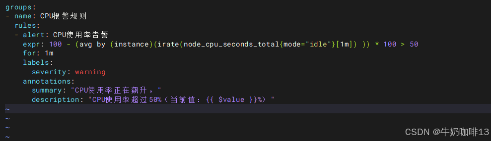 description: "CPU使用率超过50%(当前值:{{ $value }}%)"