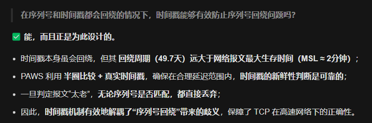 - 为了保证PAWS算法能正确工作,新连接初始数据包的时间戳必须大于前一个处于TIME_WAIT状态的连接所记录的最后时间戳。内核设定1秒的等待期,是为了确保新连接的时间戳有足够大的增量 (因为系统时间戳通常以毫秒或微秒为单位递增,但是某些嵌入式或者老系统可能每秒才加1[1Hz])。这有效避免了新连接时间戳与旧连接相同导致新链接被丢弃.