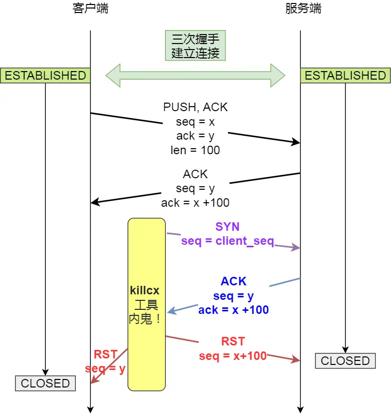 - 如果服务端发送了数据包给客户端,由于客户端的连接已经被关闭了,此时客户的内核就会回 RST 报文,服务端收到后就会释放连接。