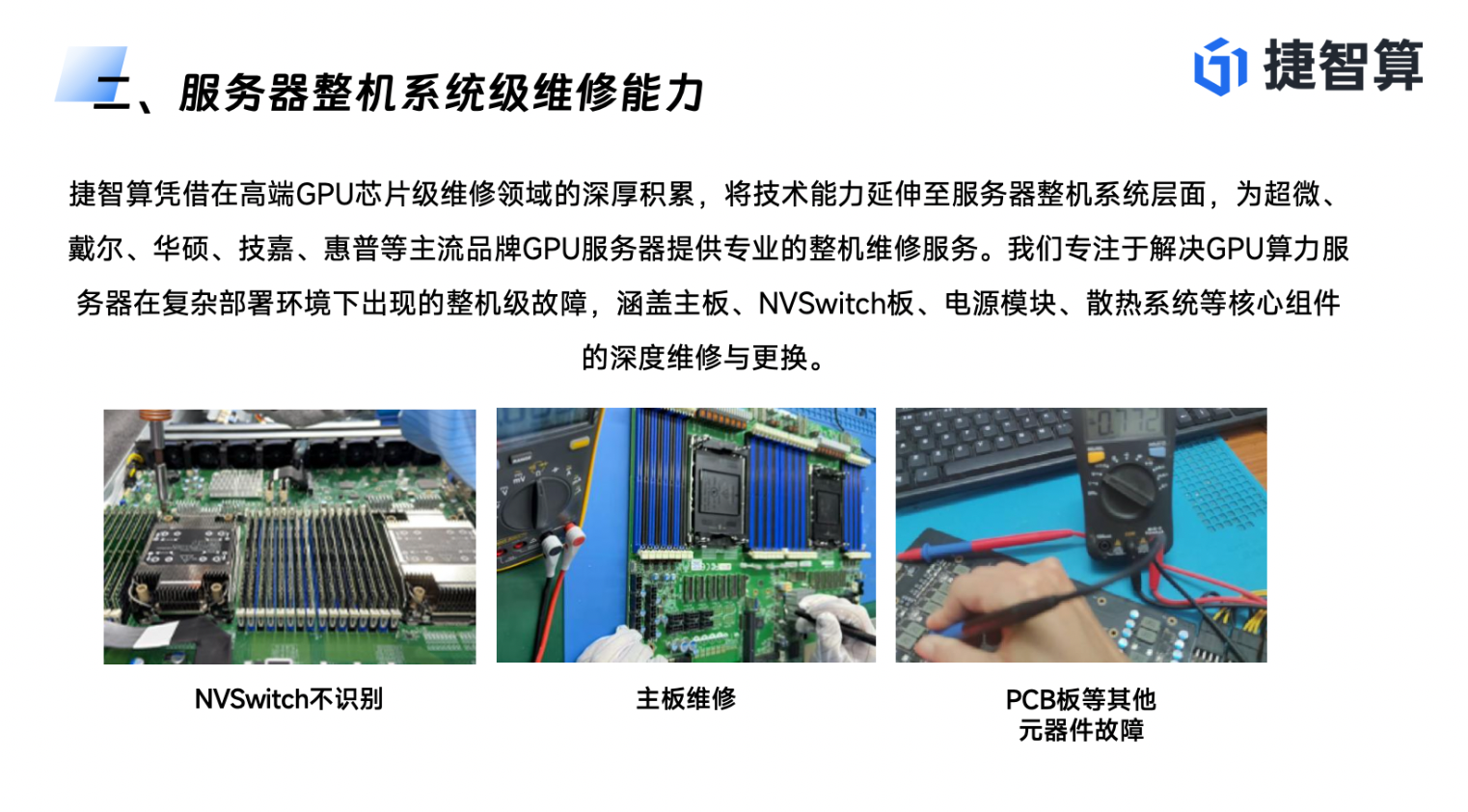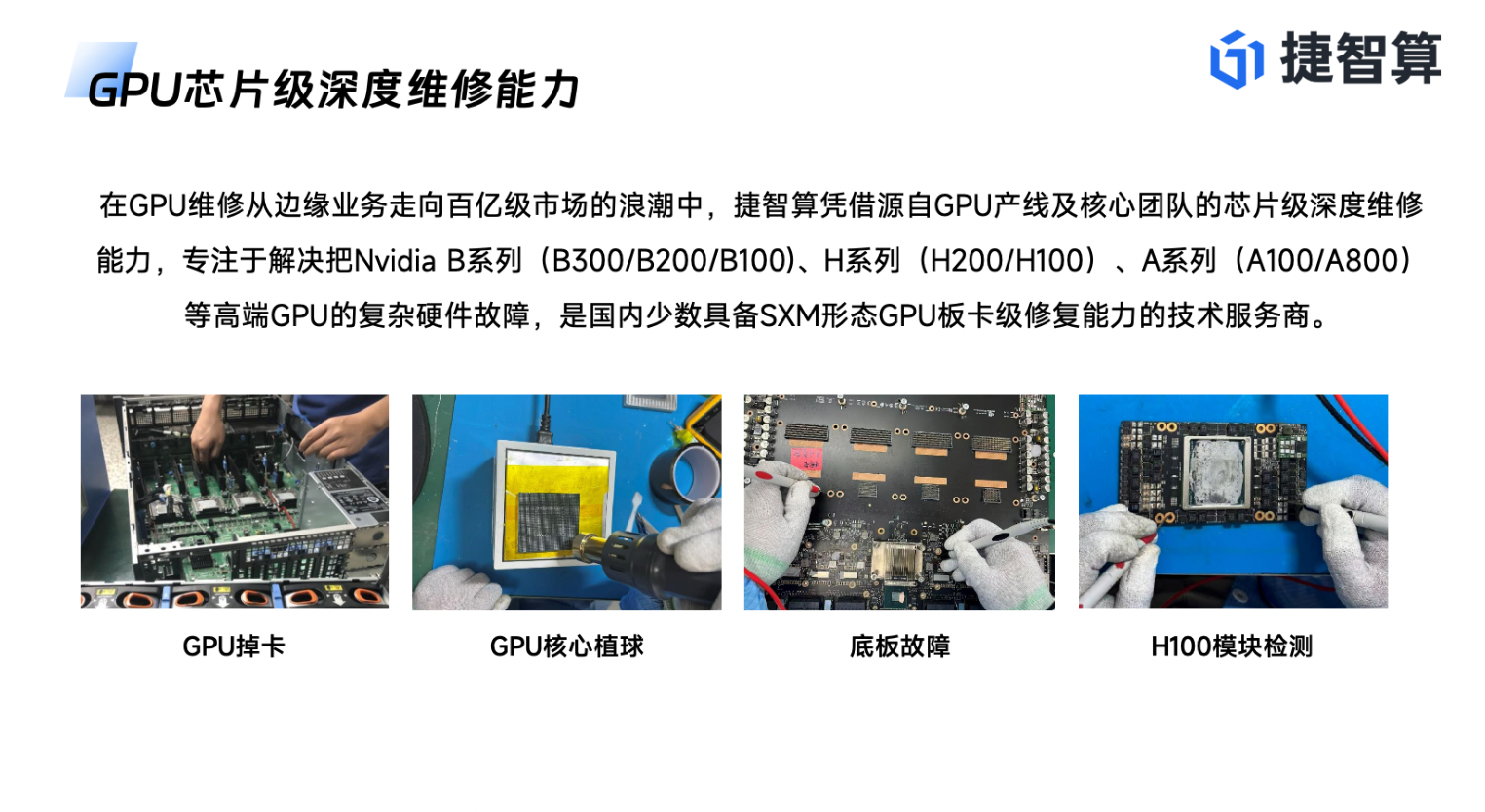 在复杂的算力集群环境中,故障往往具有连锁反应。GPU掉卡可能源于主板供电不足,服务器无法开机可能是NVSwitch板故障。如果维修商只能修GPU,不能修整机,那么客户依然需要将服务器拆解后分头送修,沟通成本极高,且难以根治问题。捷智算GPU维修中心凭借在高端GPU芯片级维修领域的深厚积累,将技术能力延伸至服务器整机系统层面,提供真正的全栈式维修服务。