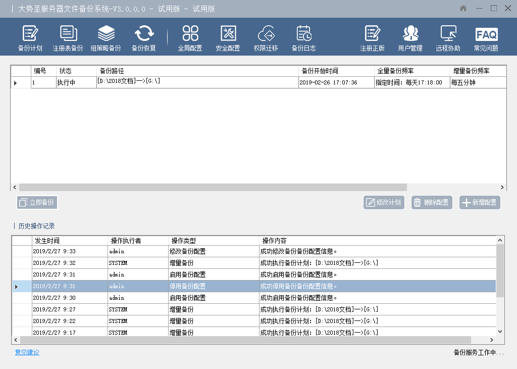 大势至服务器文件备份系统(dashizhi.com) ,通过在服务器上安装之后,就可以定时定量将服务器的文件备份到外接硬盘、NAS等设备上,实现了服务器文件、机密数据、商业机密的实时备份和保全。如下图: