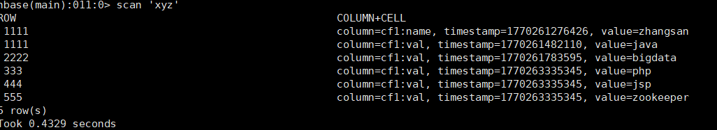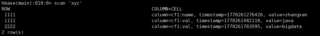 hbase(main):003:0> put 'xyz','1111','cf1:val','java'