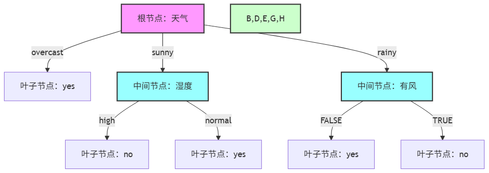 步骤3:选择"有风"作为分裂特征,分裂为两个子节点: 有风=FALSE:3条数据(3yes),输出结果"yes";