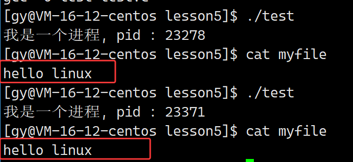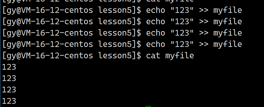 echo "123" > myfile:我们发现myfile中数据由hello linux -> 123,再次echo "123" > myfile,文件中依旧是123,> myfile文件直接被清空了。- echo在命令行输入之后,变为一个进程,重定向到myfile,一定要将文件打开(w方式打开)