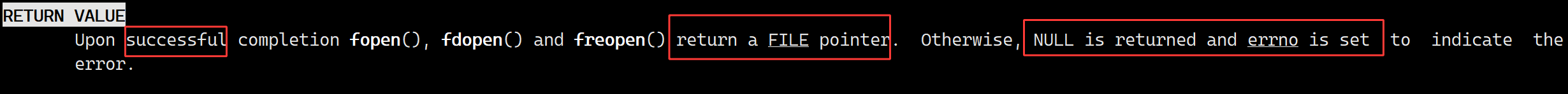 - 当fopen函数调用成功返回一个FILE指针 (C语言提供的数据类型),失败返回NULL并设置错误码