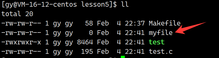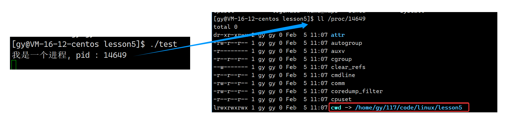ls /proc/[进程id] -l命令查看当前正在运行进程的信息,我们可以看到该进程中有cwd,这就是为什么我们fopen的第一个参数只传入文件名,会自动在当前工作路径目录下(/home/gy/117/code/linux/lesson5)新建文件:/home/gy/117/code/linux/lesson5/myfile