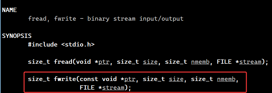 const void *ptr:传入的写入数据size_t size:写入时的基本单元size_t nmemb:写入几个基本单元