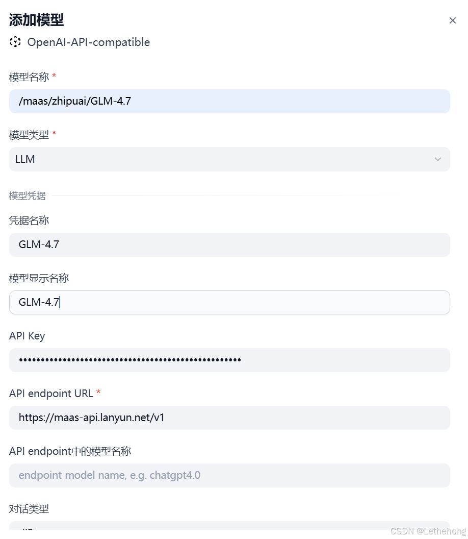 接入 GLM-4.7 模型:在 Dify 平台中配置并调用高性能的 GLM-4.7 模型。