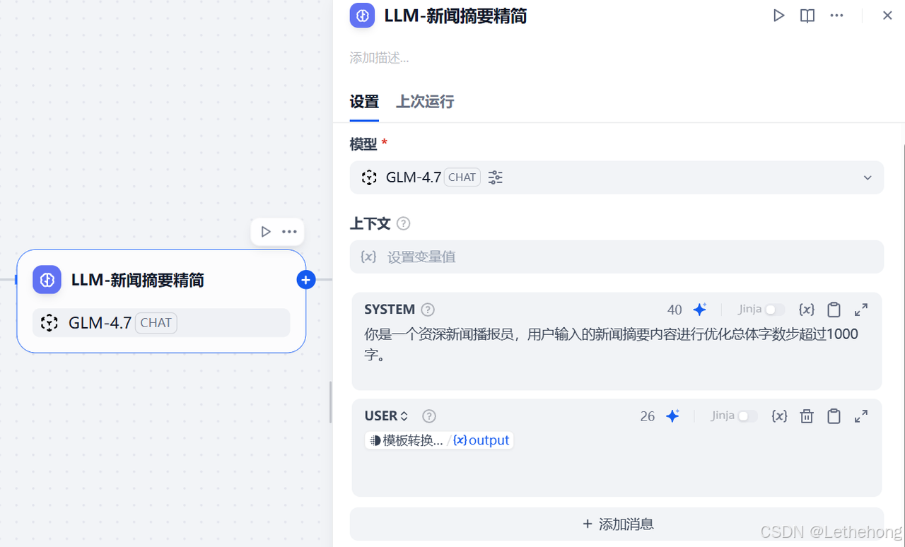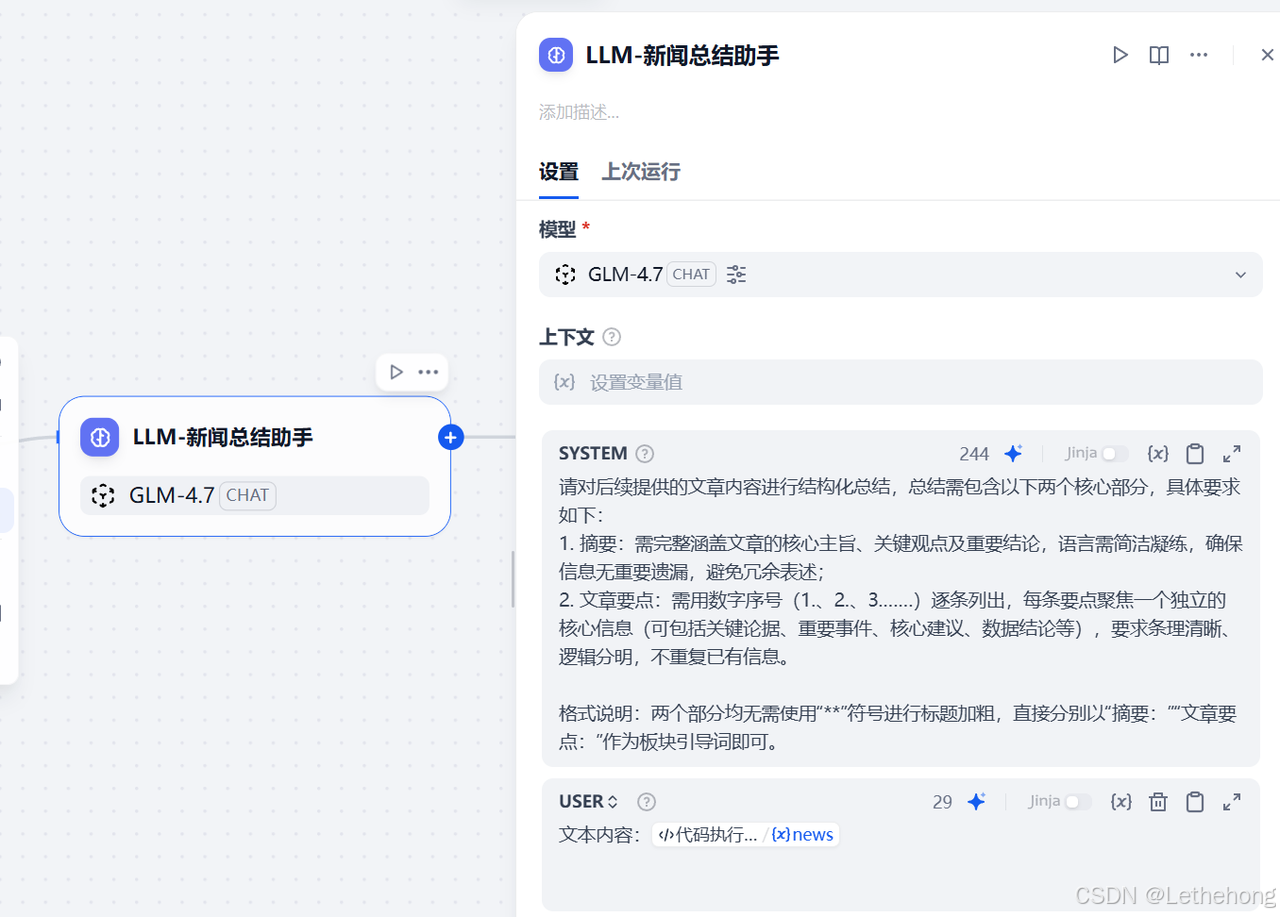 在获取到新闻列表和详情后,接下来使用 LLM 节点对新闻进行结构化总结。本例中我们选择调用前面配置的 GLM-4.7 模型。请向模型提供如下提示词(prompt):