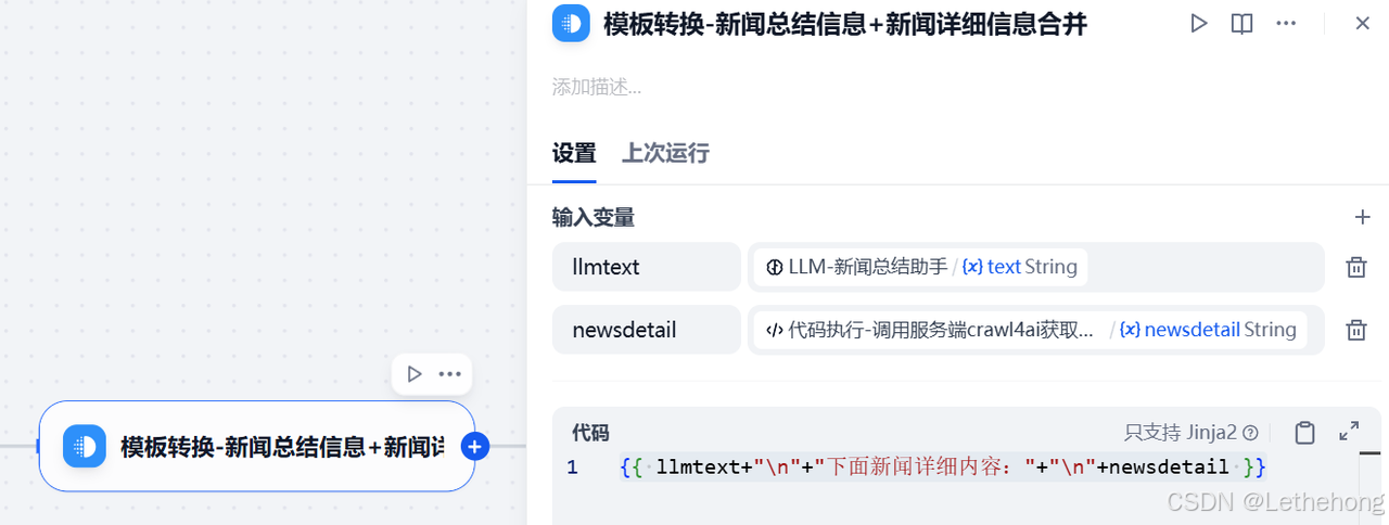 使用模板转换节点(或文本拼接)将 LLM 生成的摘要和之前获取的新闻详细内容合并,以便后续流程使用。假设我们有两个变量 llmtext(LLM 输出的总结文本)和 newsdetail(详细新闻文本),可以构造如下模板表达式: