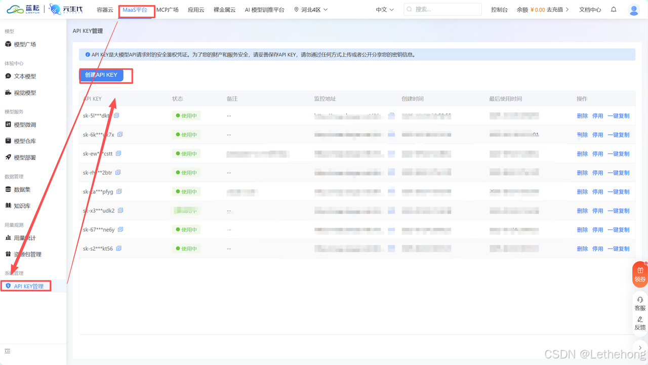 - 登录 蓝耘 MaaS 平台 ,进入"API Key 管理"页面,复制您已生成的有效 API Key。