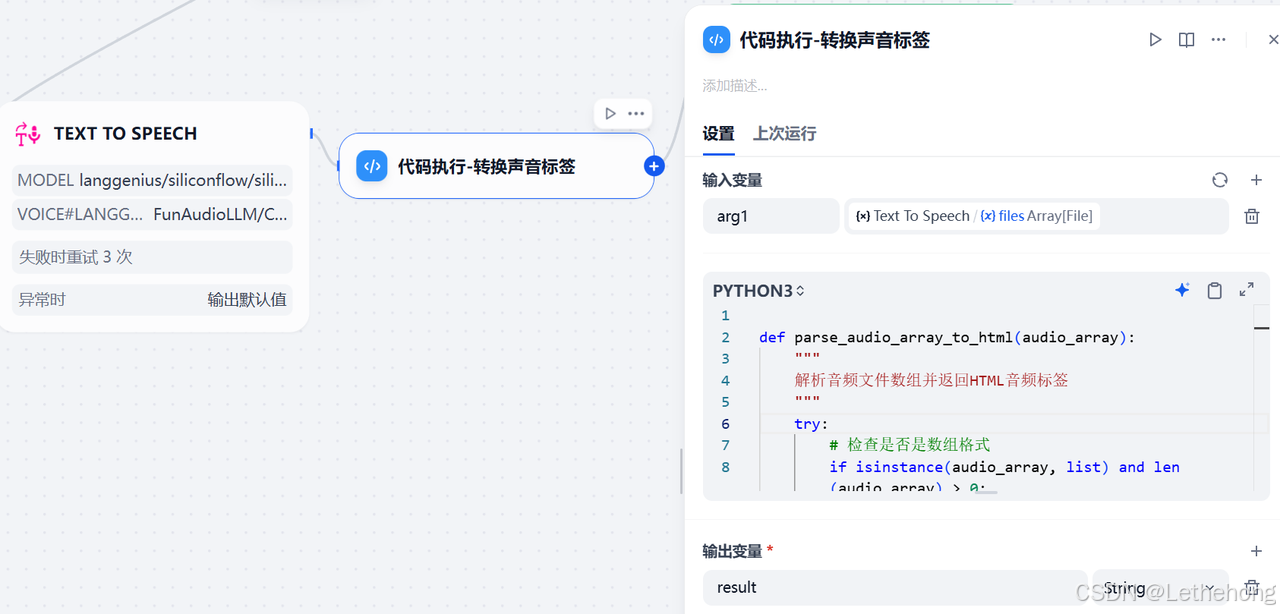 最后,将处理好的文字发送给语音合成服务,实现文字到语音的转换。在 Dify 平台中可以使用语音合成节点。以下提供一个示例 Python 函数,用于将返回的音频文件数组转换为 HTML 音频标签,方便在网页或应用中直接播放: