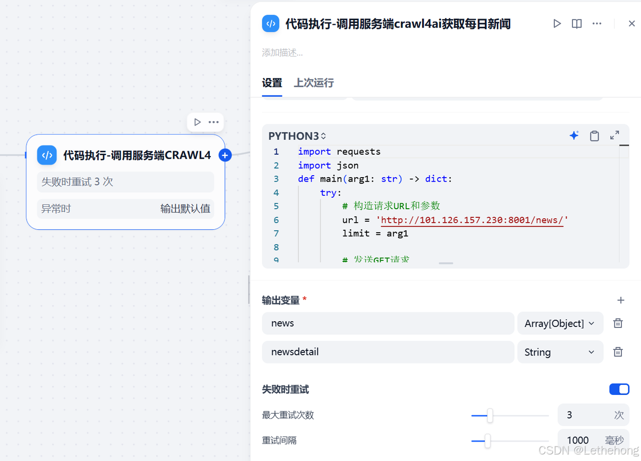 代码节点:调用服务端 crawl4ai 获取新闻数据