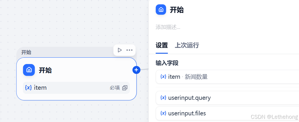 在 Dify 平台的工作流编辑器中,首先配置工作流的输入变量,确保后续节点能够接收到正确的上下文信息。具体操作如下: