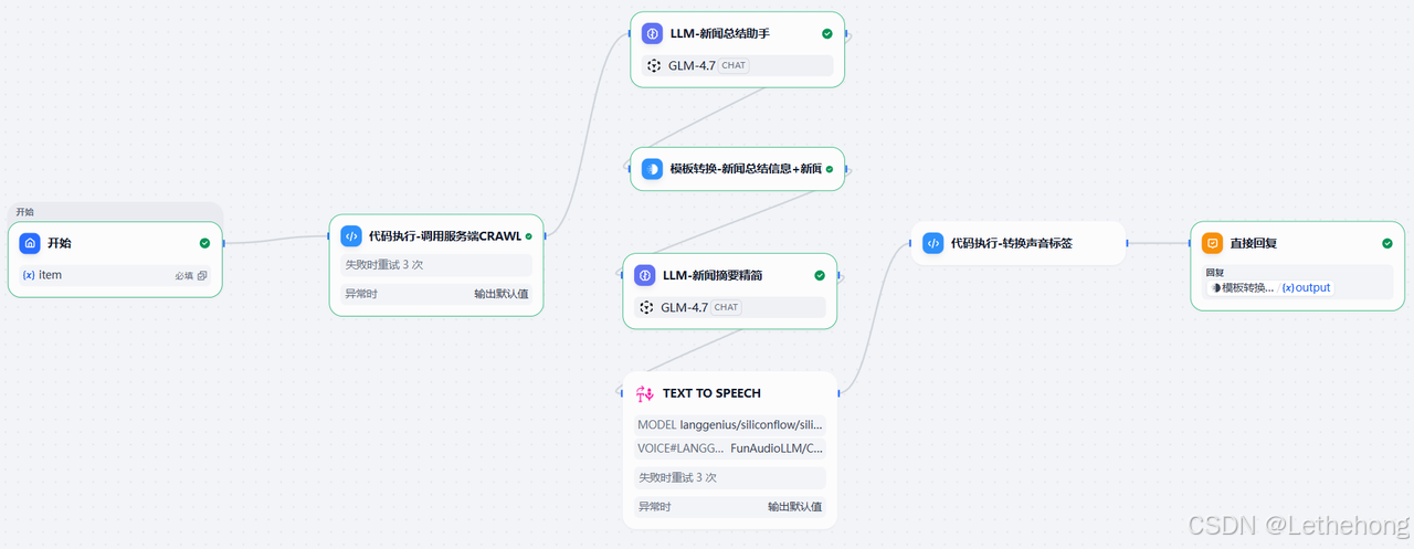 至此,将所有节点串联完成后,接入一个结束节点即可结束工作流。最终,当用户触发该流程时,系统会依次执行新闻爬取、摘要、合并、精炼和语音播报等步骤,实现一个全流程自动化的多功能 AI 工作流。