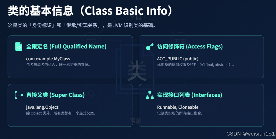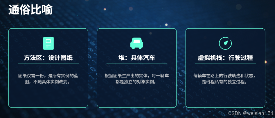 .class字节码加载为统一的类元数据,存储在方法区; - 堆中的对象实例通过方法区的类元数据确定自身的属性、方法等信息;