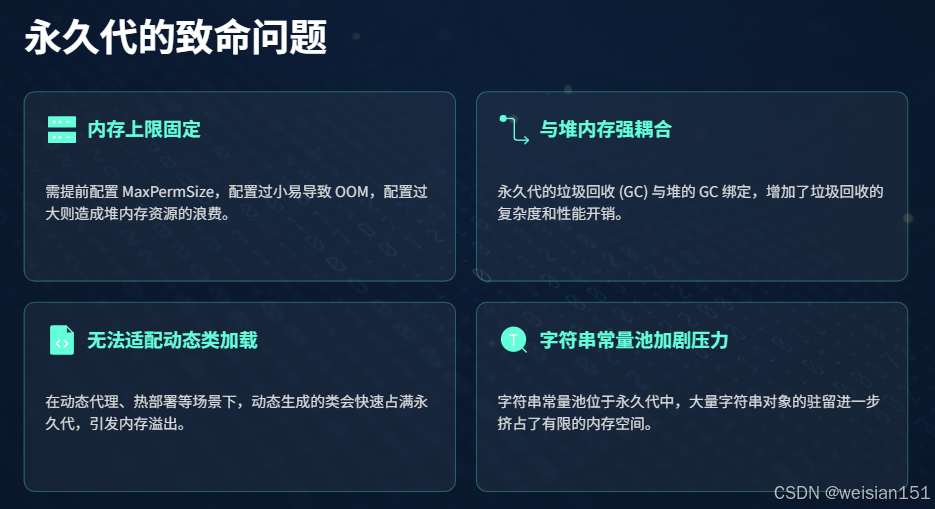 永久代作为 JVM 堆内存的一部分,其最大问题是内存大小受限于 JVM 堆,而类元数据的数量可能远超出预期(如动态代理、热部署、插件化应用会动态生成大量类),极易导致:
