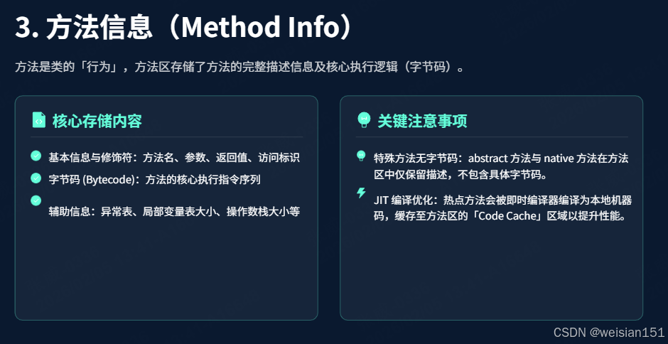 | 虚拟机栈(VM Stack) | - 栈帧中的"动态链接"依赖方法区符号引用- 方法字节码从方法区读取,由解释器/JIT 执行 |