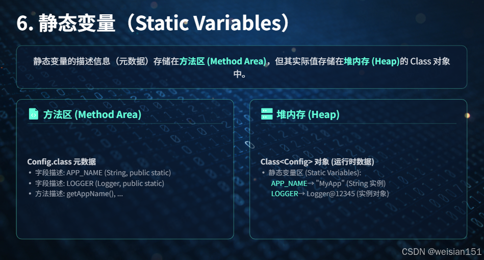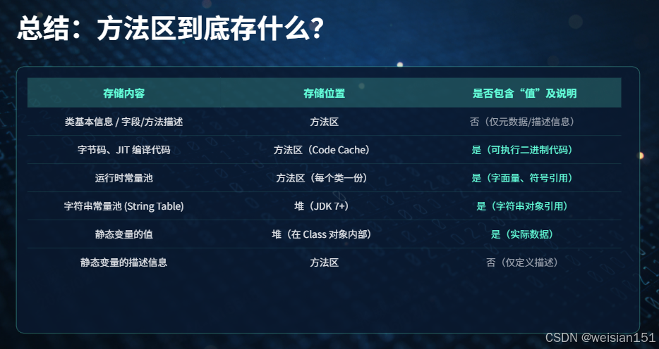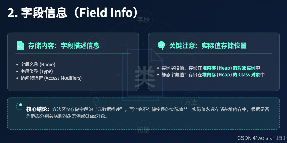 - 元数据存储:存储类的"定义信息",而非对象实例,是堆中对象的"模板"。