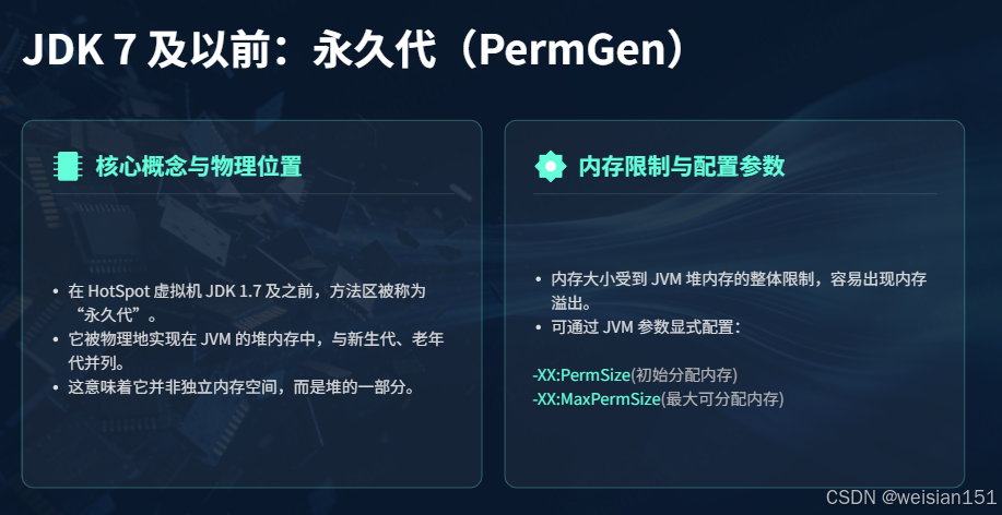 - JDK 1.7 及之前 :物理实现为「永久代(PermGen)」,属于堆的一部分,有固定内存上限(容易 OOM: