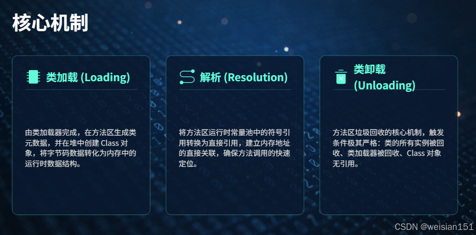 - 懒加载与按需加载:类元数据并非启动时全部加载,而是在首次使用时由类加载器加载,符合 JVM 的懒加载设计。