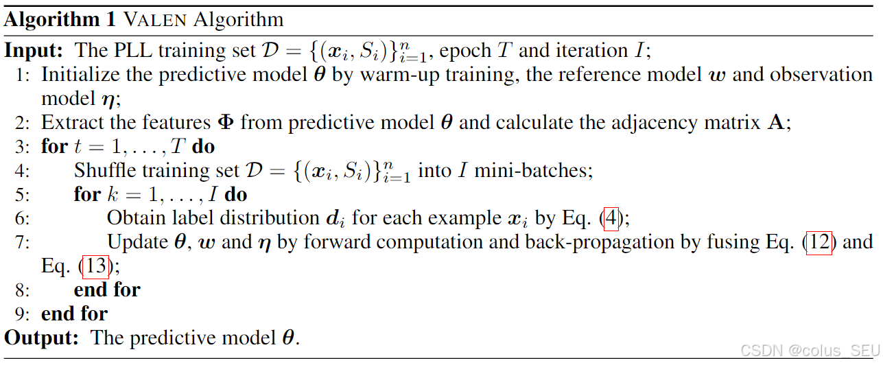 Here we adopt the average value of \boldsymbol{d}_i sampled by \boldsymbol{d}_i \sim Dir(\boldsymbol{\alpha}_i). We can use any deep neural network as the predictive model, and then equip it with the VALEN framework to deal with PLL. Note that we could train the predictive model and update the label distributions in a principled end-to-end manner by fusing the objective Eq. (12) and Eq. (13). The algorithmic description of the VALEN is shown in Algorithm 1.