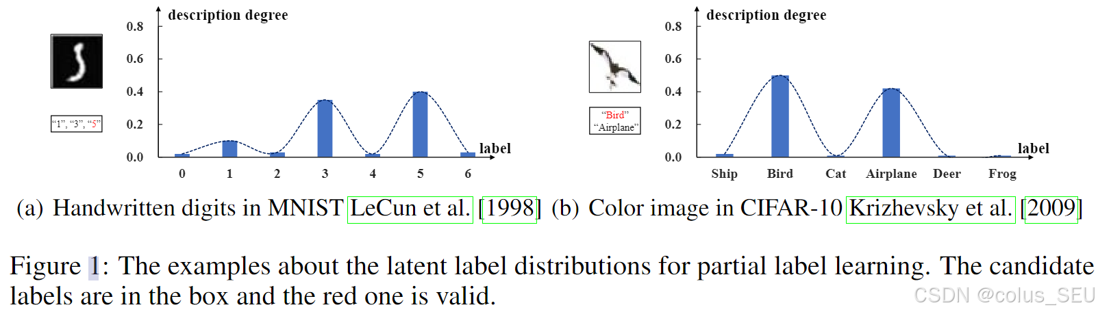 ID-PLL问题的假设:每个样本都与一个潜在标签分布相关联,该分布由每个标签的实数构成,代表了每个标签描述特征的程度。具有较高程度的错误标签更有可能被标注为候选标签。(说人话就是:每个样本有一个标签置信度分布,该分布未知,且错误标签中置信度高的更可能是候选标签,如figure1中所示。)
