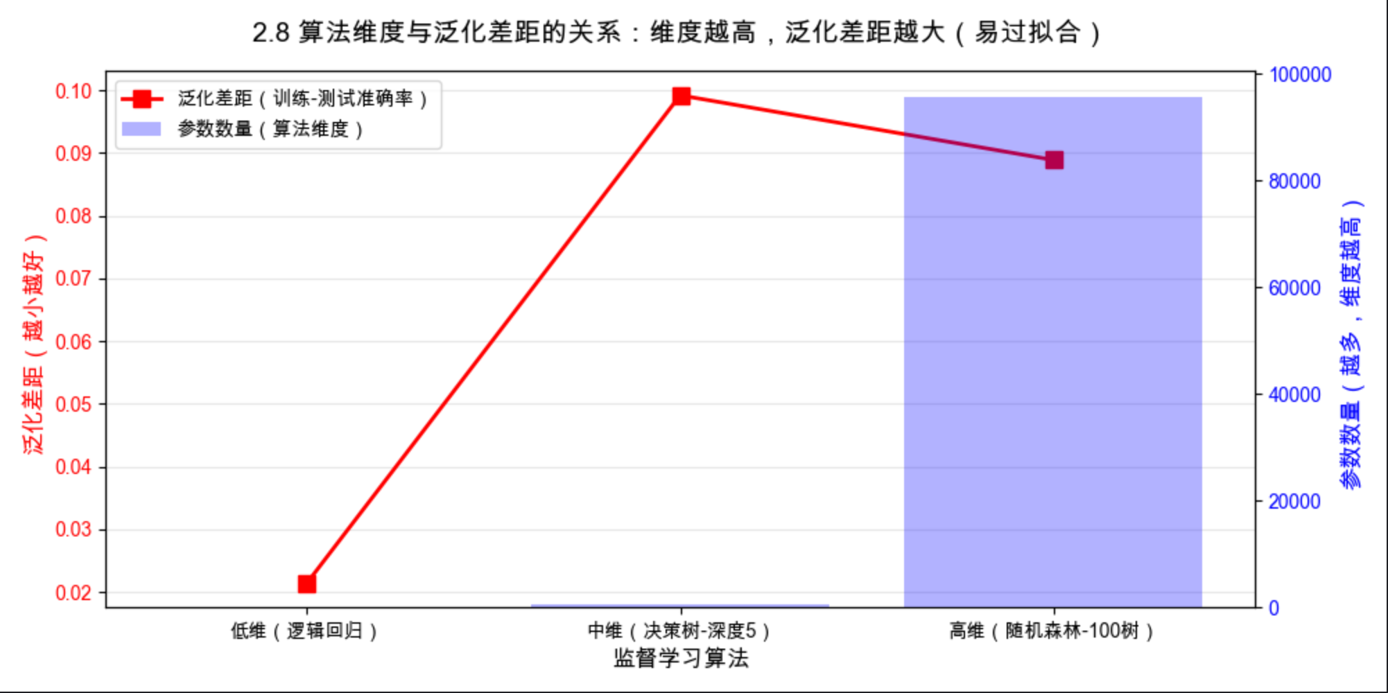 # -------------------------- 7. 可视化2:算法维度与泛化差距的关系(双y轴图)--------------------------
