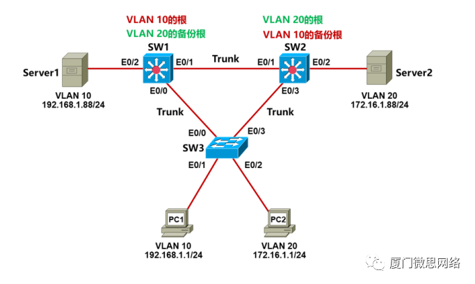 针对VLAN20,SW3的E0/0是阻塞的,E0/3是转发的,这样PC2访问Server2的路径就是:PC2->SW3->SW2->Server2。