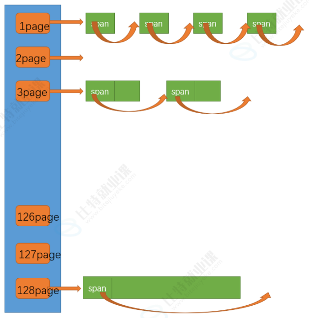如下图所示,page cache也是哈希桶的映射结构,每个page上面会挂载着spanlist,但是要值得注意的是,当page cache从堆区申请回来一大块内存时,不是直接切好的,一下图为例,申请完的内存128page的span就挂在128那个桶里,假如我现在要2page的内存,就在这个128page的内存上切割,切成2page和126page,前者就被分配走了,让central cache拿走了,后者就挂在126page那个桶上了~