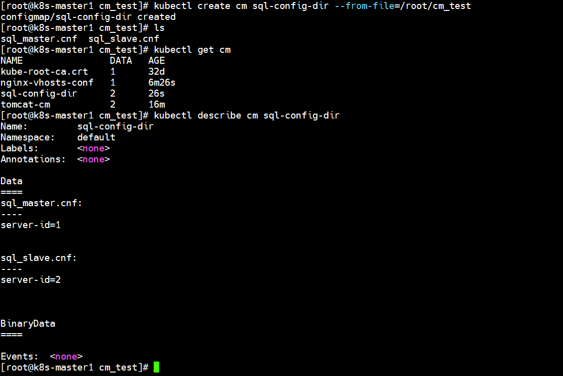 [root@k8s-master1 cm_test]# kubectl create cm sql-config-dir --from-file=/root/cm_test