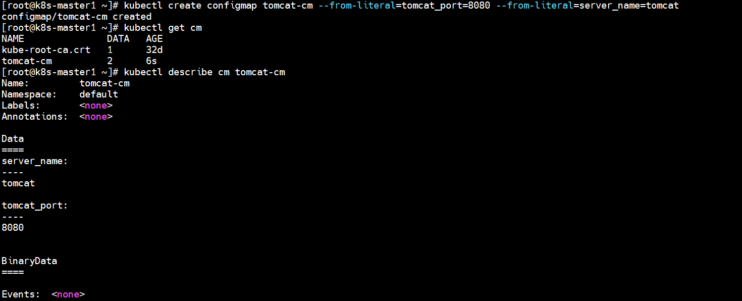 [root@k8s-master1 ~]# kubectl create configmap tomcat-cm --from-literal=tomcat_port=8080 --from-literal=server_name=tomcat