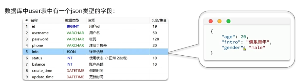 JSON类型就是在进行数据库查询时,mysql提供的一些特殊的查询语法,本质就是一个字符串。