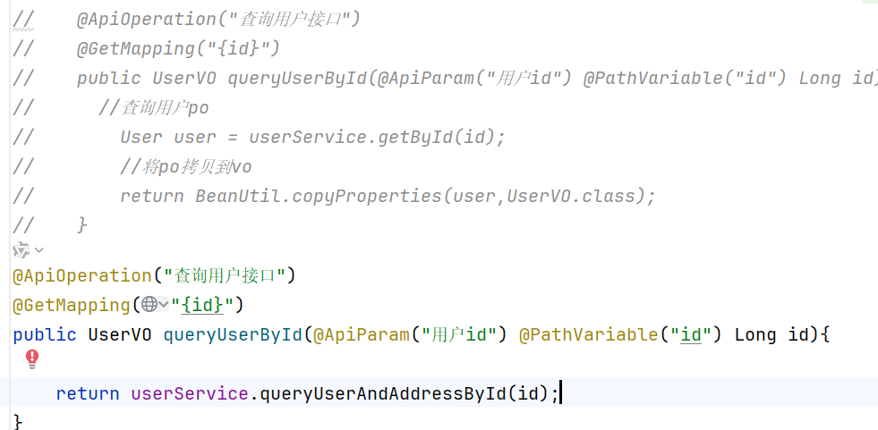 public UserVO queryUserById(@ApiParam("用户id") @PathVariable("id") Long id){