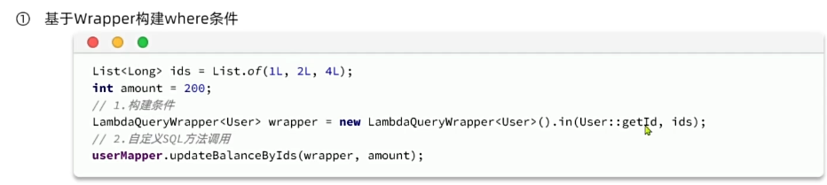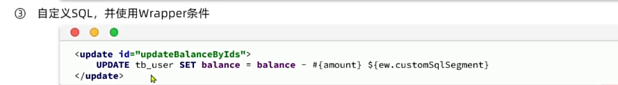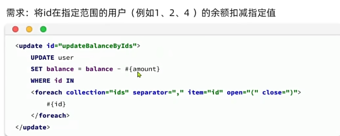 其实就是mp很擅长进行where查询的部分,<foreach>这一步直接使用in来代替。而sql语句前半部分则不一定。大多数场景mp都能完成,但少部分比如在原有值的基础上进行操作,即动态:
