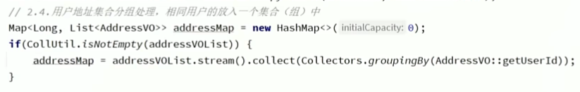 groupingBy(要分的类,根据什么分),Map<Long,List<AddressVo>>这个long就是map的key,即用户的id