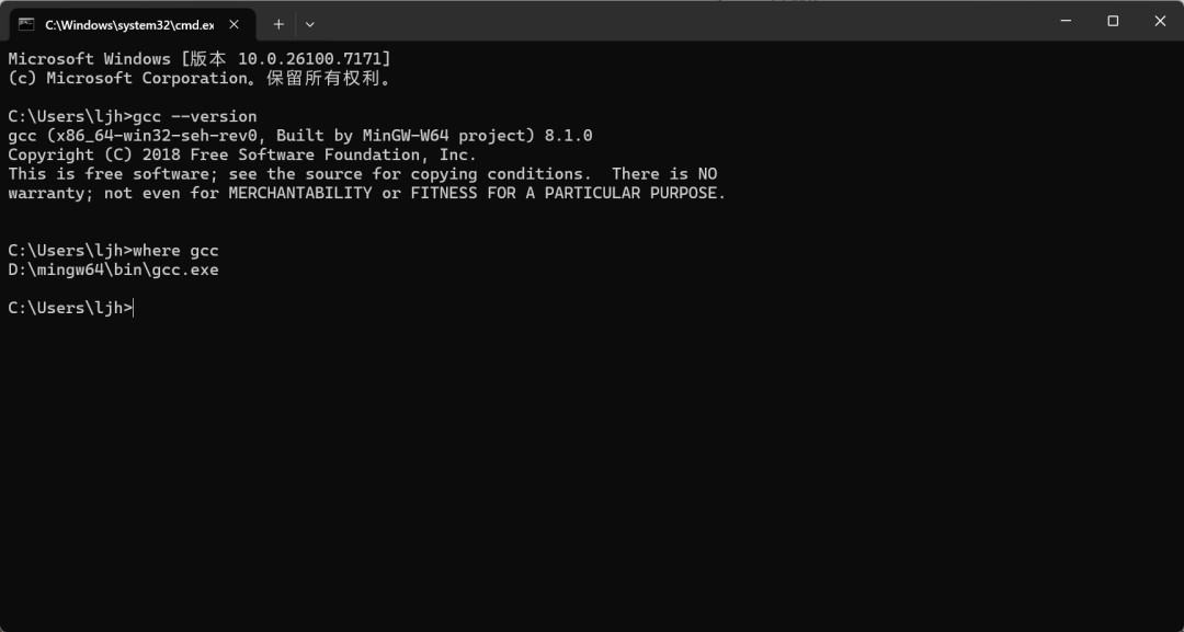 按win+r,输入cmd。接着输入gcc --version和where gcc,如果能全部查到,说明MinGW-w64配置完成了。