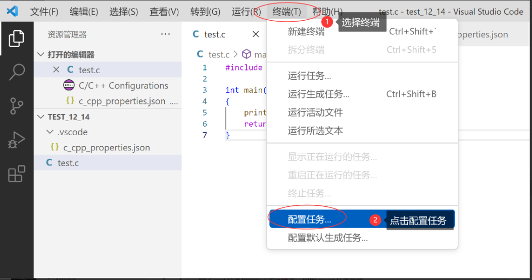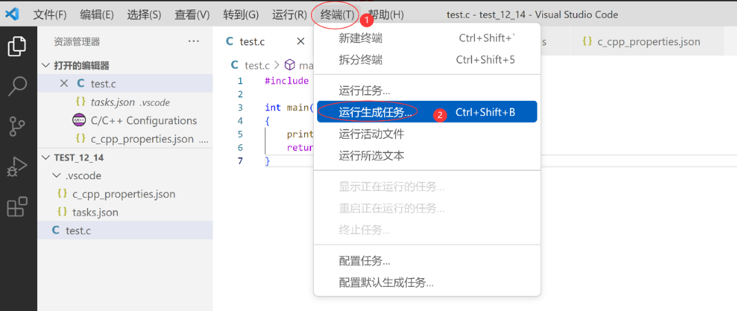 首先,鼠标点在要编译的C语言代码中,然后执行【终端】->【运行生成任务】