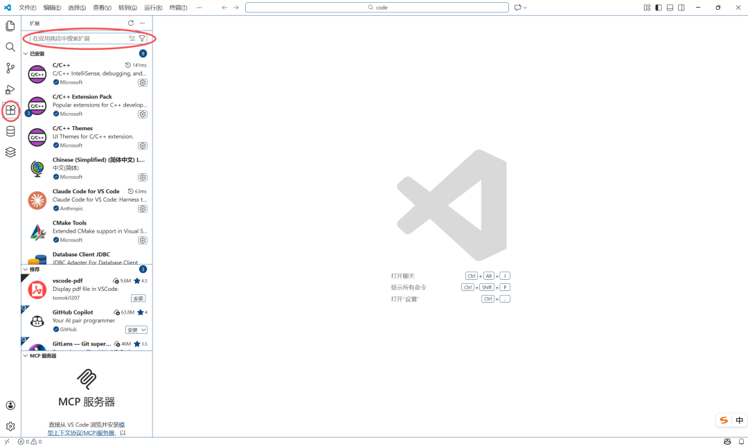 在如图所示的地方搜索Chinese,显示的第一个就是汉化包,直接点Install即可。接着,重启VSCode,就会显示中文啦。