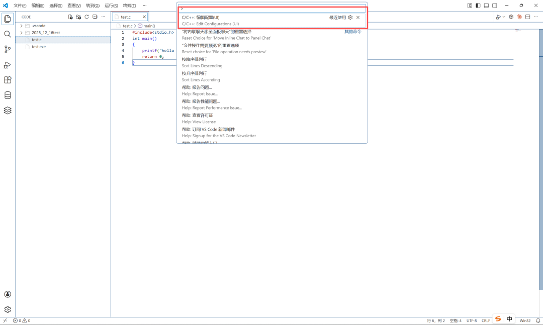 鼠标点在.c的源文件内部,按ctrl+shift+p快捷键,在弹出的界面中选择【C/C++:编辑配置(UI)】,然后进入设置页面。