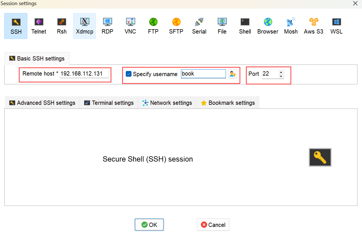 第一个就是你的en33的IP,然后第二个就是你这个虚拟机的用户名,第三个就是网络端,Port 22 是 SSH(安全远程登录协议) 的默认端口。当你发起 SSH 连接时,目标设备会通过 22 这个端口,识别并处理你的远程登录请求,这里我们直接填22即可,因为就是远程登录。