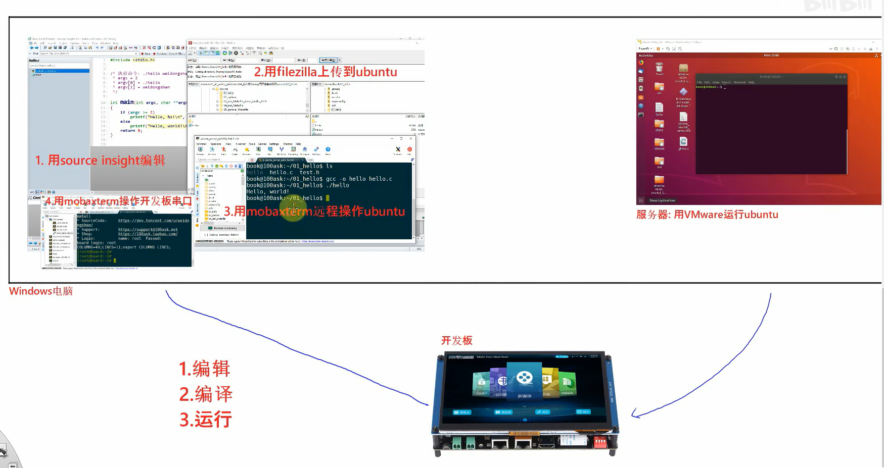 window系统上:使用filezilla将使得两个系统可以进行文件互传,source insight用来编辑原码和查看linux内核源码,mobaxtren远程操作ubuntu和操作串口(window进行编辑操作)