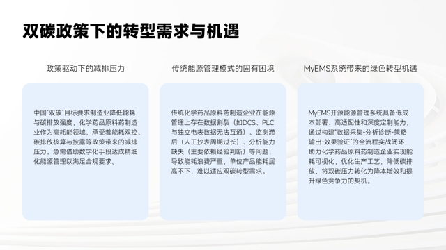 化学药品原料药制造业在双碳政策下既面临转型需求,也拥有转型机遇。从政策层面看,中国"双碳"目标使该行业承受着能耗双控、碳排放核算与披露等政策带来的减排压力,需要借助数字化手段实现精细化能源管理以合规。