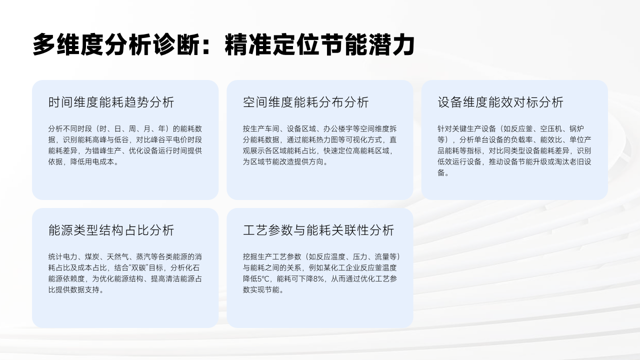 节能分析模块通过与历史同期、行业标杆对比基准能耗,以及诊断能耗异常,精准定位节能潜力点,如老旧设备和不合理的空调运行时间等,为企业节能优化提供方向。