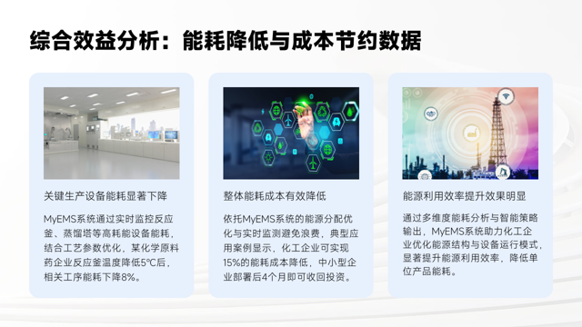 此外,能源利用效率提升效果明显。通过多维度能耗分析与智能策略输出,MyEMS系统助力化工企业优化能源结构与设备运行模式,显著提升能源利用效率,降低单位产品能耗。
