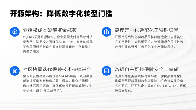 前面分析了双碳政策下化学药品原料药制造业的转型需求与机遇,强调了MyEMS系统带来的绿色转型可能。本页聚焦于MyEMS开源能源管理系统的核心优势,这将详细阐释它为何能助力企业转型。后续我们将具体了解其各项优势如何发挥作用。