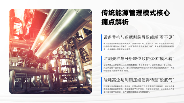 传统能源管理模式存在诸多核心痛点。其一,设备异构与数据割裂导致能耗"看不见"。化工企业设备种类多且分属不同厂商,早期DCS、PLC与后期能耗仪表数据格式和通信协议不兼容,如同文件散落在不同抽屉,无法呈现完整能耗图景,企业难以全面掌握能耗情况。