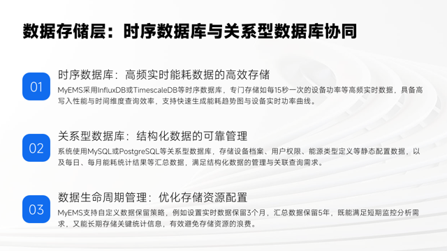 关系型数据库则使用MySQL或PostgreSQL等,负责存储设备档案、用户权限、能源类型定义等静态配置数据,以及每日、每月能耗统计结果等汇总数据,满足结构化数据的管理与关联查询需求。