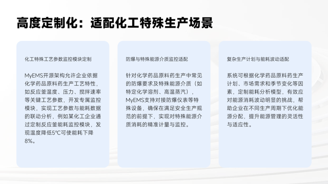前面我们详细了解了MyEMS从数据采集到全流程闭环的各层架构与功能。本页将聚焦MyEMS核心功能模块在化工场景的应用。这能让我们清晰看到该系统如何在实际化工生产中发挥作用。接下来,让我们具体看看它在化工场景应用的精彩表现。